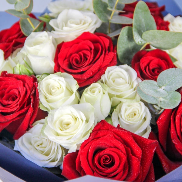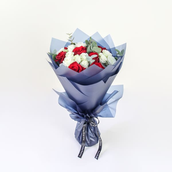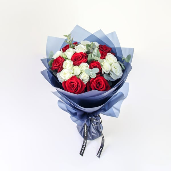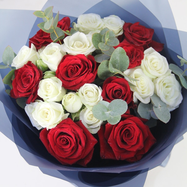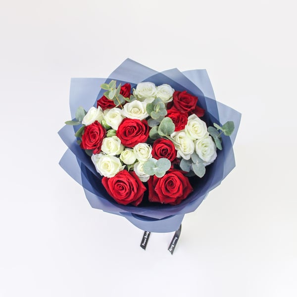 A classic mix of red and white roses wrapped in elegant dark blue/slate paper and accented with some eucalyptus foliage