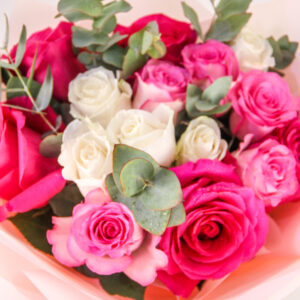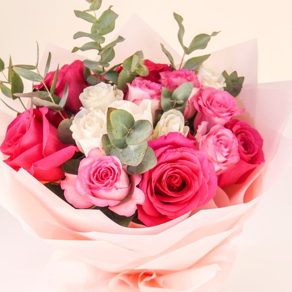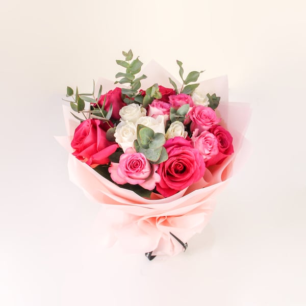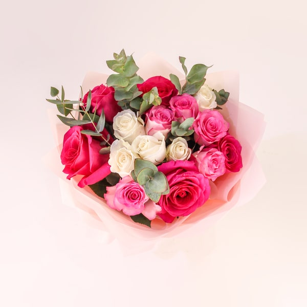 A beautiful bouquet features a lovely mix of hot pink, medium pink, and white roses, accented with eucalyptus and wrapped in soft light pink wrapping.