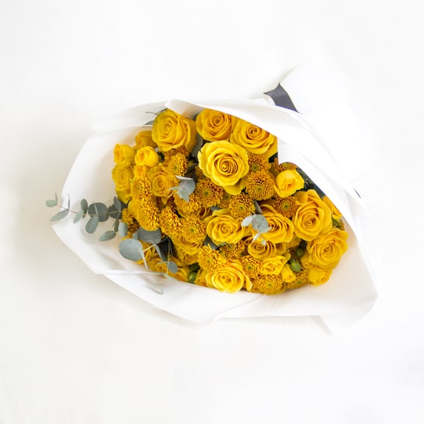A yellow bouquet with Roses, Chrysanthemum and Eucalyptus in white wrapping paper with black ribbon.