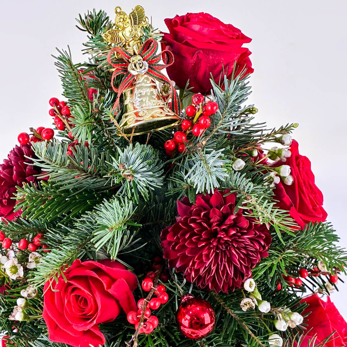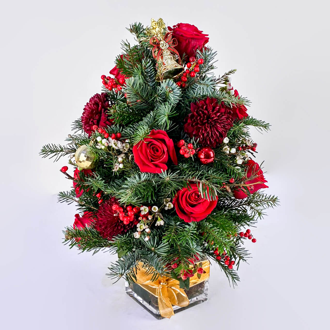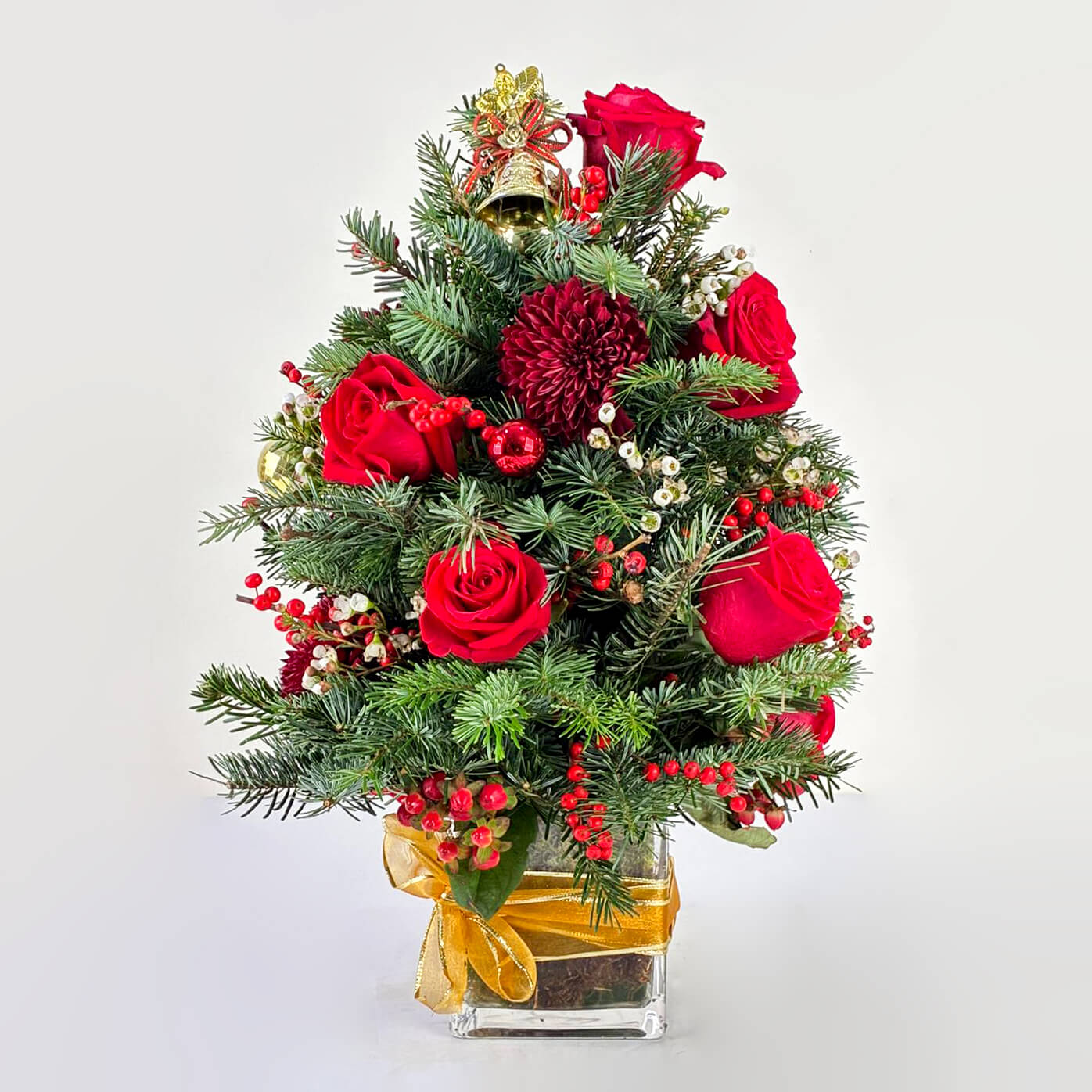 Bring the charm of a classic Christmas tree to any small space with this enchanting miniature floral tree. Artfully crafted to mimic the structure of a holiday evergreen, this arrangement blends traditional holiday textures with the elegance of premium blooms.