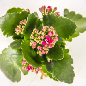 This low-maintenance Kalanchoe features beautiful clusters of rosy-pink blooms and buds atop thick green leaves. It is nestled in a sage-green dimpled ceramic planter and finished with a rustic jute twine bow, making it an easy and delightful way to bring long-lasting color into any space.
