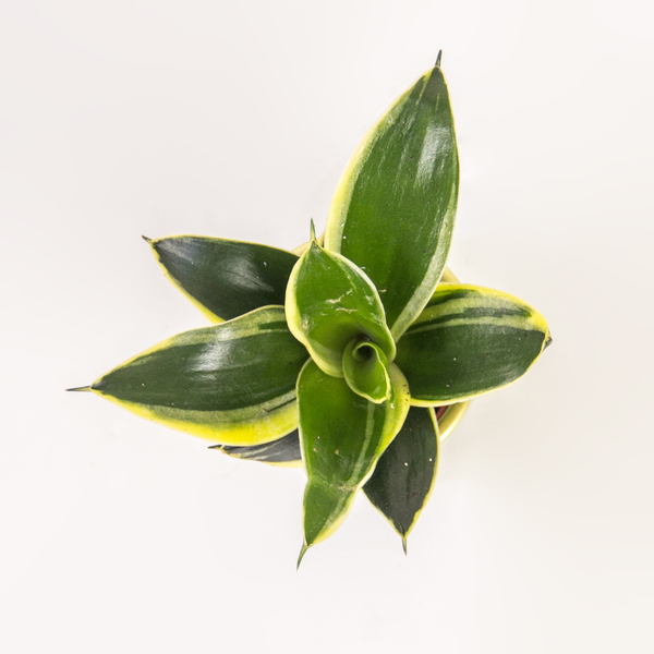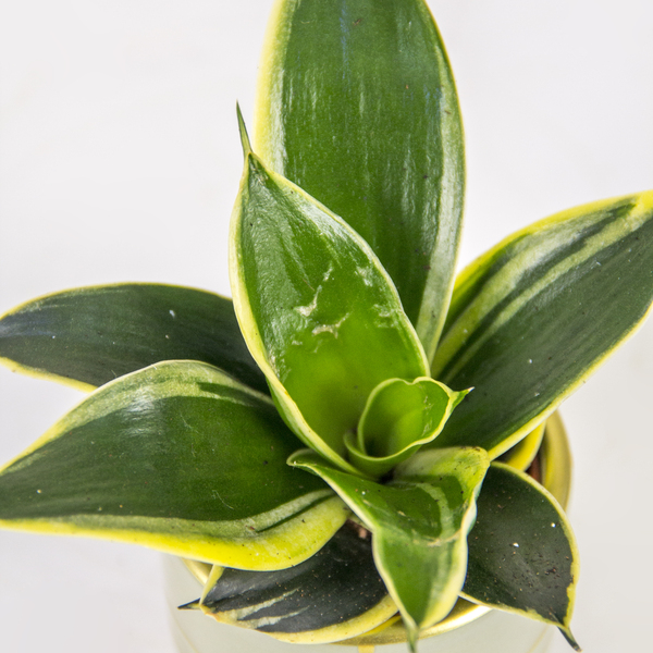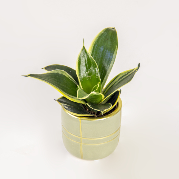 An elegant, air-purifying plant with striking variegated leaves that feature bright gold edges. It comes potted in a chic sage green ceramic container with a modern, gilded grid pattern.