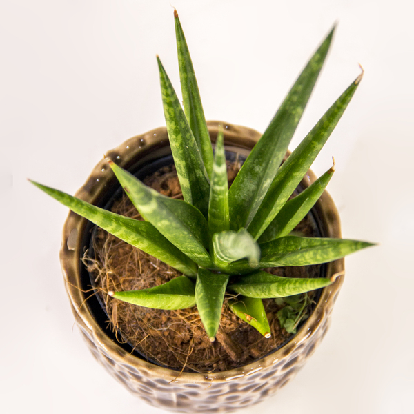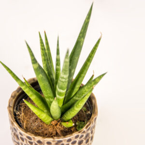 A unique, architectural succulent with rigid, upright, patterned leaves. It’s incredibly low-maintenance and potted in a rich bronze ceramic container featuring a deeply textured, eye-catching bubble design.