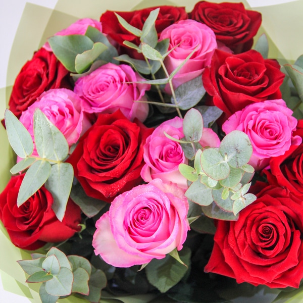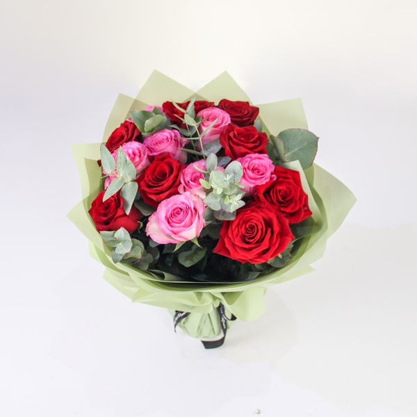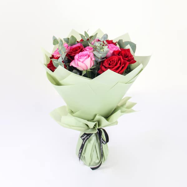 A lovely, vibrant mix bouquet features red and pink roses with eucalyptus foliage, all wrapped in a fresh pastel green wrapped.