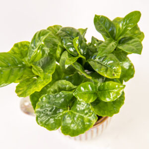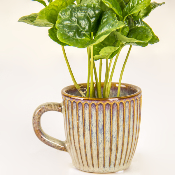This product features a vibrant, young Coffea Arabica plant—known for its glossy, undulating green leaves—potted in an artisanal ceramic mug. The planter boasts a beautiful iridescent, streaked glaze in tones of cream and rustic brown, making it a perfect, low-maintenance accent for a cozy desk or shelf.