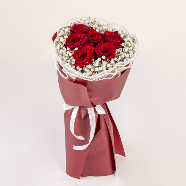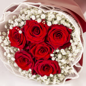 Six premium red roses nestled in a delicate bed of white baby’s breath.