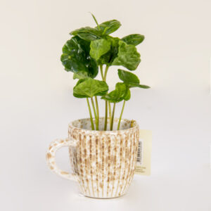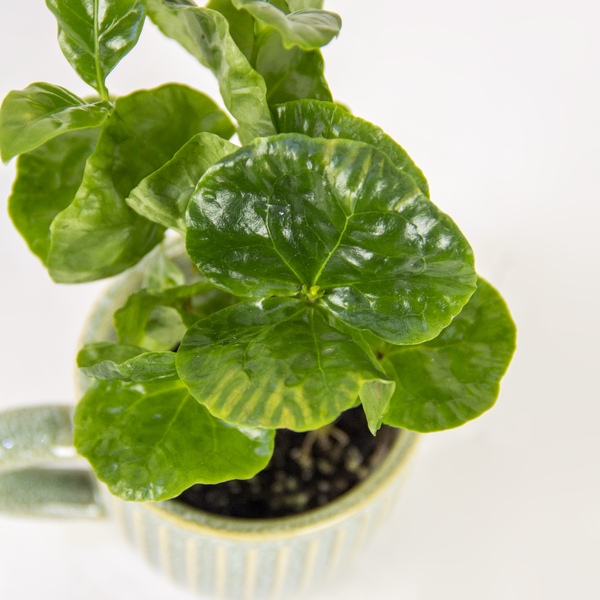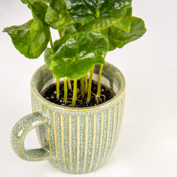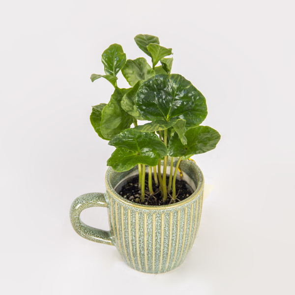 This handsome young Coffee Plant thrives indoors and is potted in an attractive, artisanal mug with a subtle stripe pattern. It’s a unique and rewarding plant that promises bright green leaves now and the possibility of homegrown coffee cherries later.