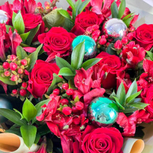 This stunning, hand-tied Christmas bouquet. Designed with a modern festive flair, this arrangement features a lush concentration of deep red roses and elegant alstroemeria.