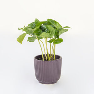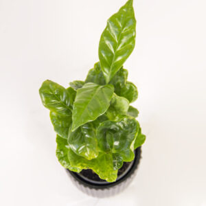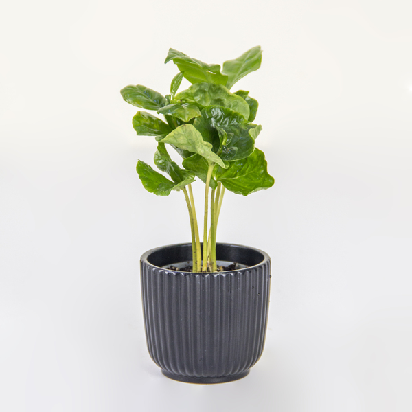 The Midnight Sprout features a cluster of vibrant Coffea Arabica seedlings, known for their glossy, undulating leaves, providing a sharp contrast to the planter. It’s potted in a contemporary matte black ceramic planter with a pronounced ribbed texture, making it a powerful, low-maintenance architectural accent for any desk or shelf.