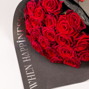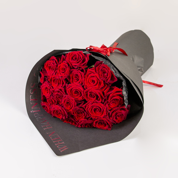 A luxurious hand-tied bouquet of deep red roses.