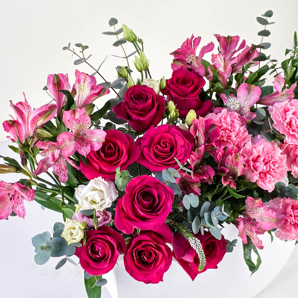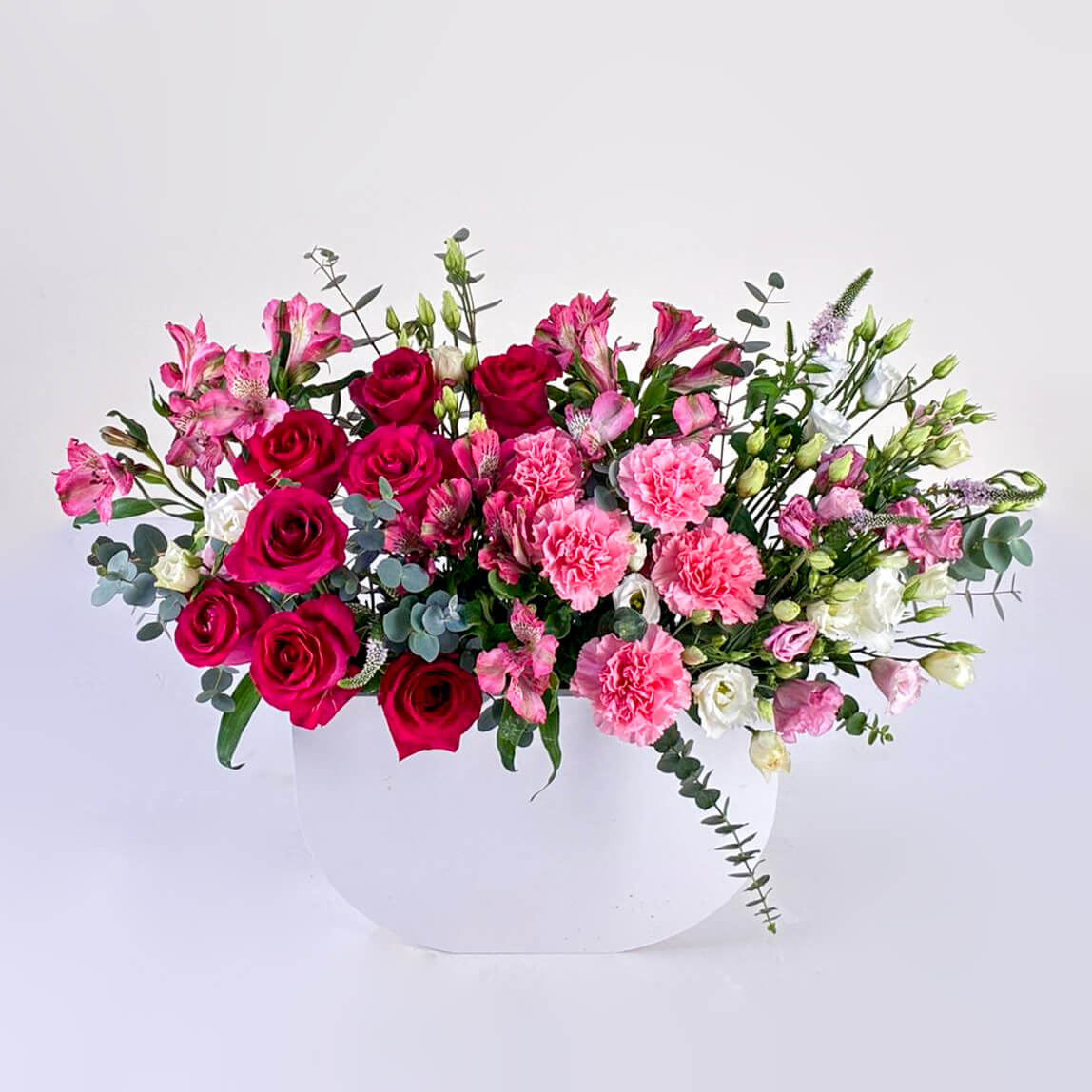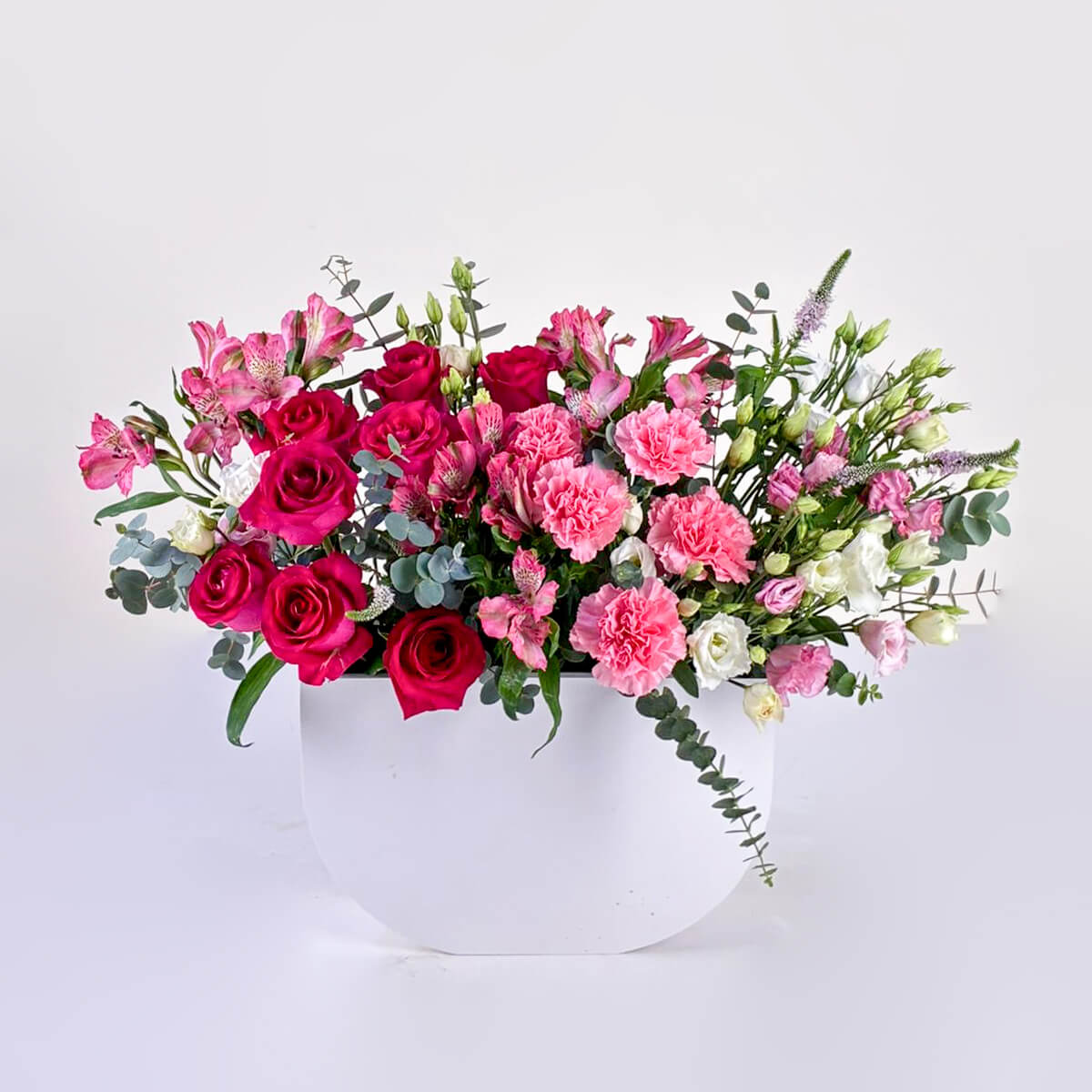 Add a touch of contemporary elegance to your holiday celebrations with this expansive, lush floral arrangement. Presented in a clean, curved white designer vessel, this display offers a romantic and modern twist on traditional Christmas colors.