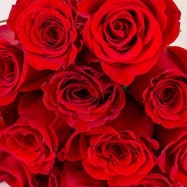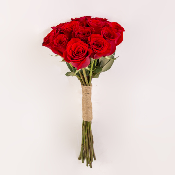 A minimalist and charming bouquet of premium red roses with the stems simply and securely bound in rustic burlap twine.